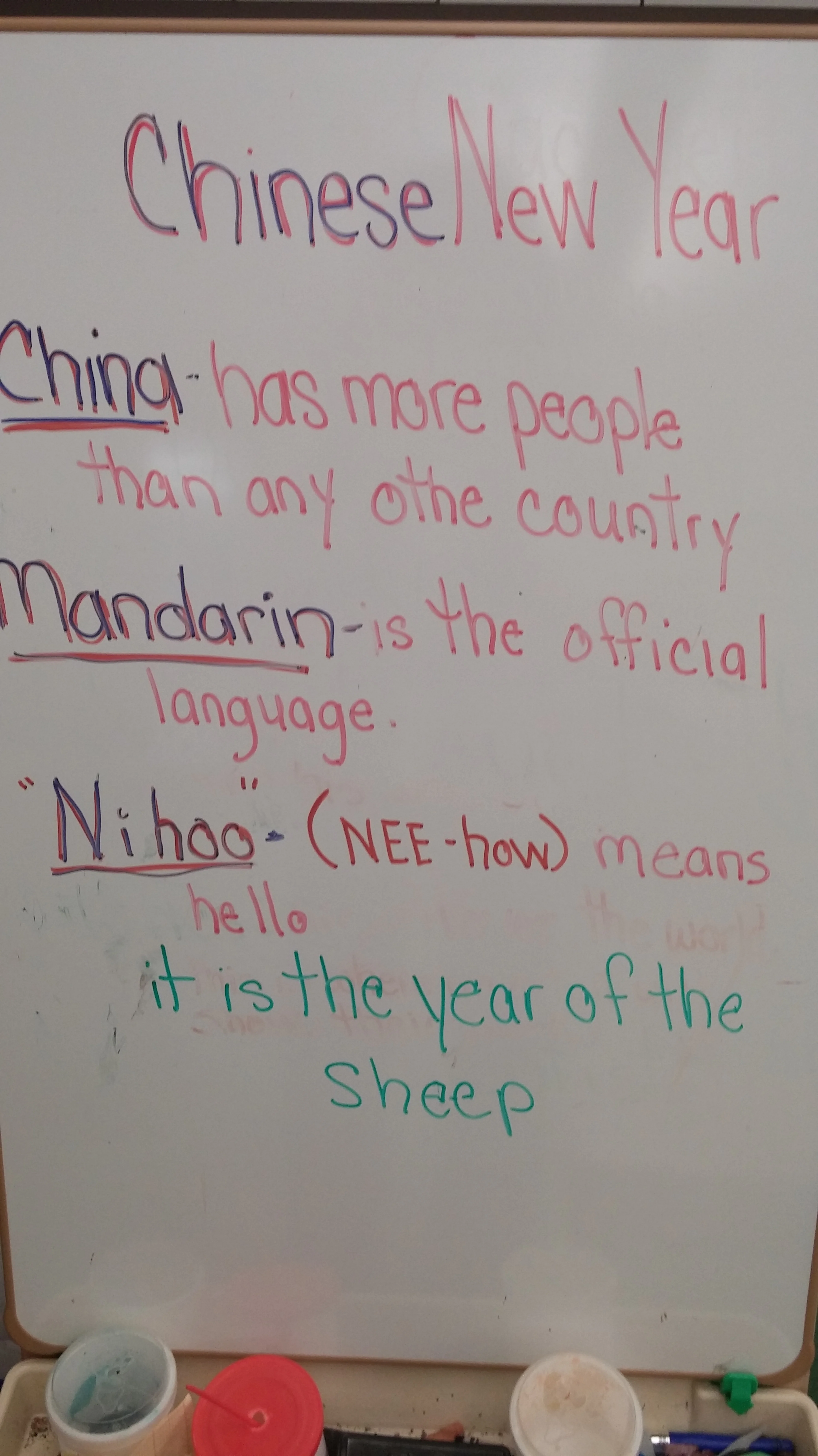 /"Ni hao" means hello! Hello from all of the children at Club Fed! Today marks the Chinese New Year, it is the year of the sheep. At Club Fed we made Chinese Lanterns, learned about China and celebrated the Chinese New Year.