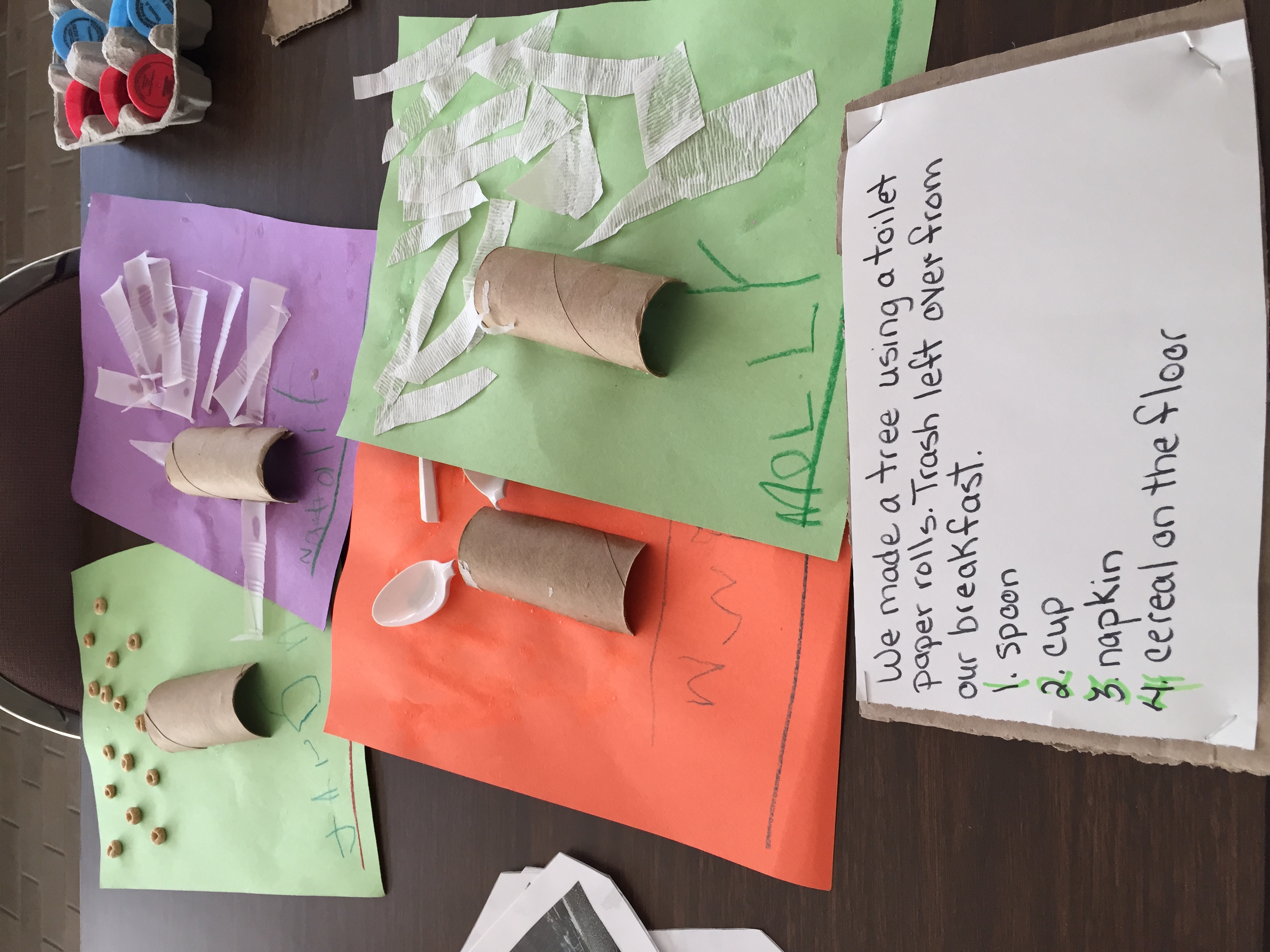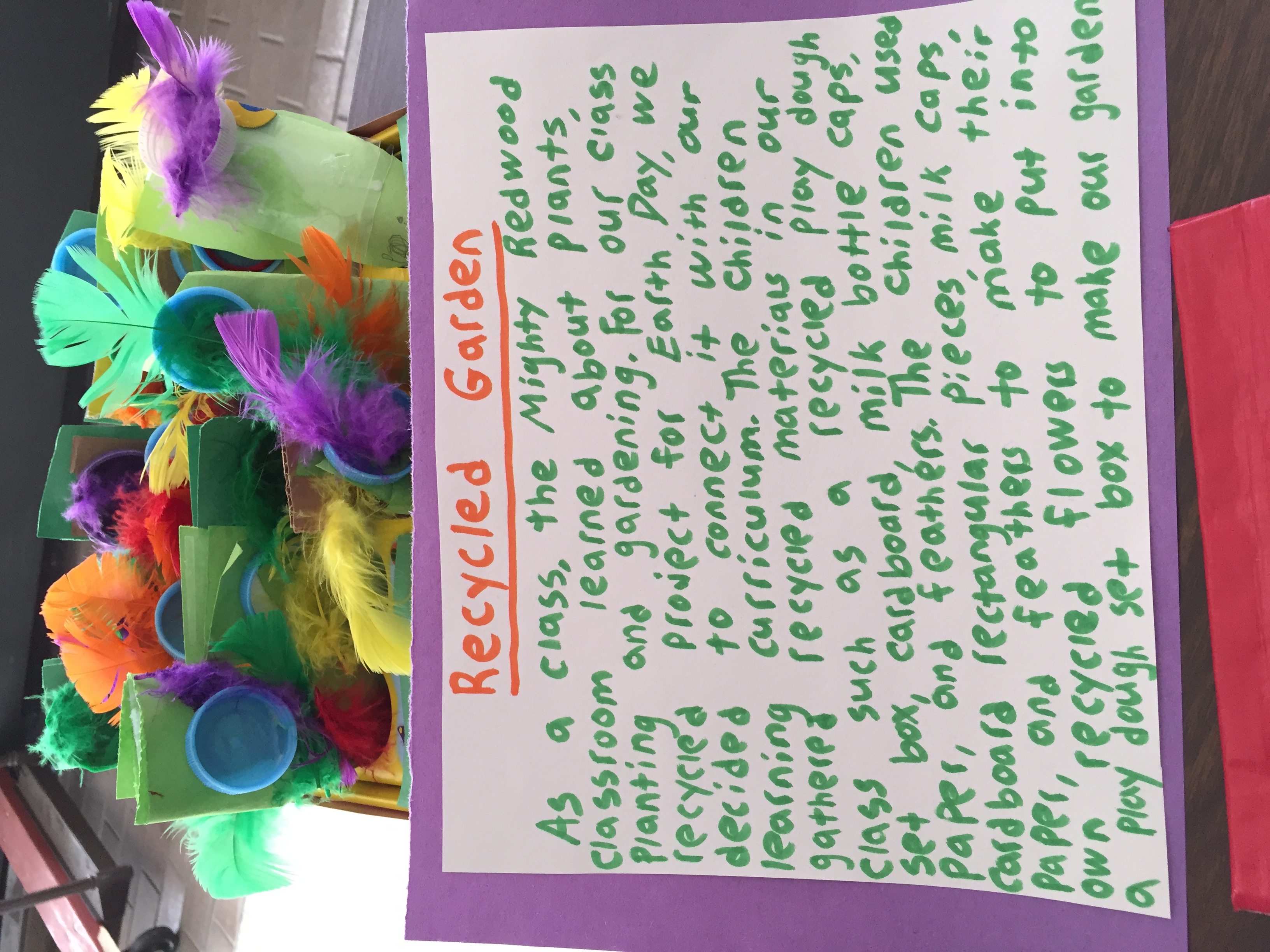/The children of Club Fed celebrated Earth Day this year by displaying their beautiful recycled art work and our recycled sensory toys! At Club Fed we know our three R's: reduce, reuse, and recycle! Our art work included trees made from cups we drank out of for breakfast and lovely arrangements of flowers made out of objects such as, tissue paper, spoons, milk bottle tops, napkins, and feathers. Also, while doing so we connected this project to our life cycle curriculum! By the children of Club Fed using recycled objects in their art and their sensory toys we are helping to eliminate the build up of trash in our environment!